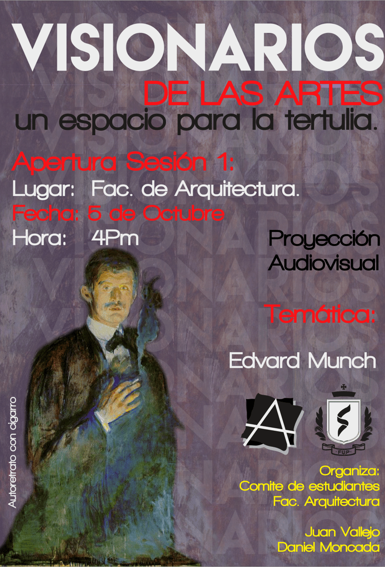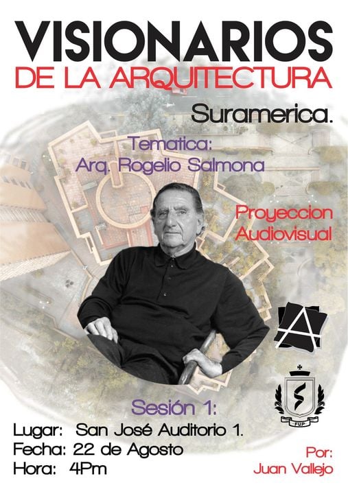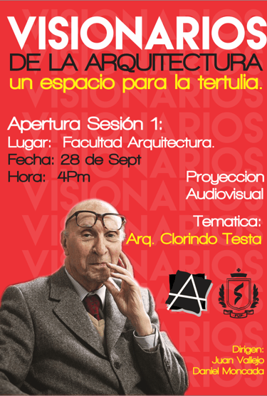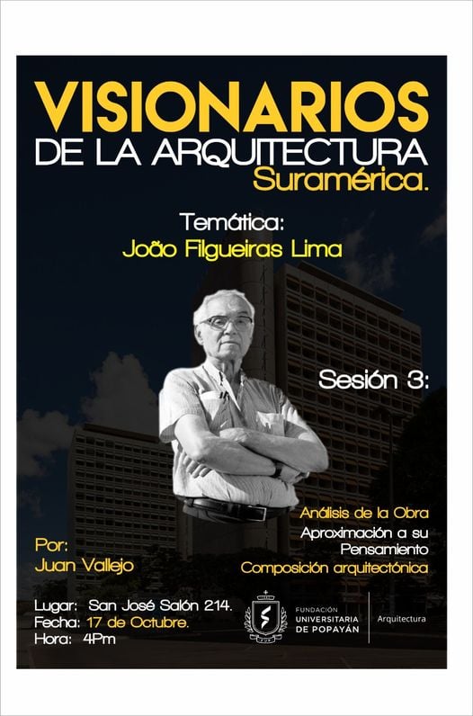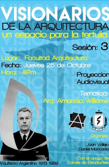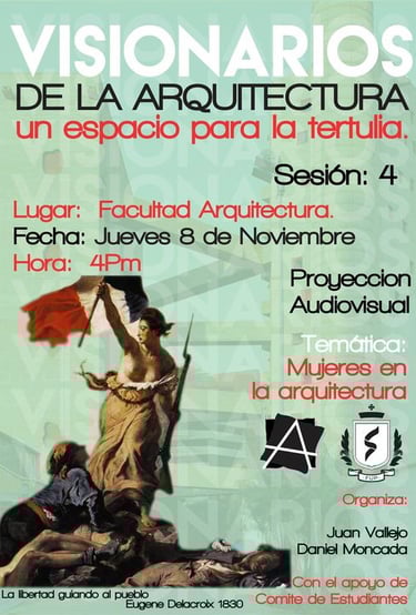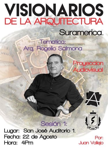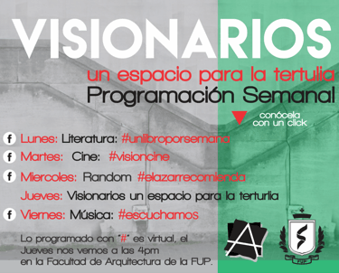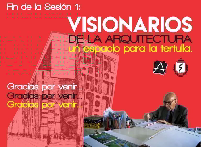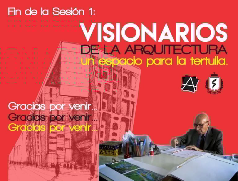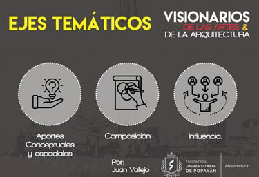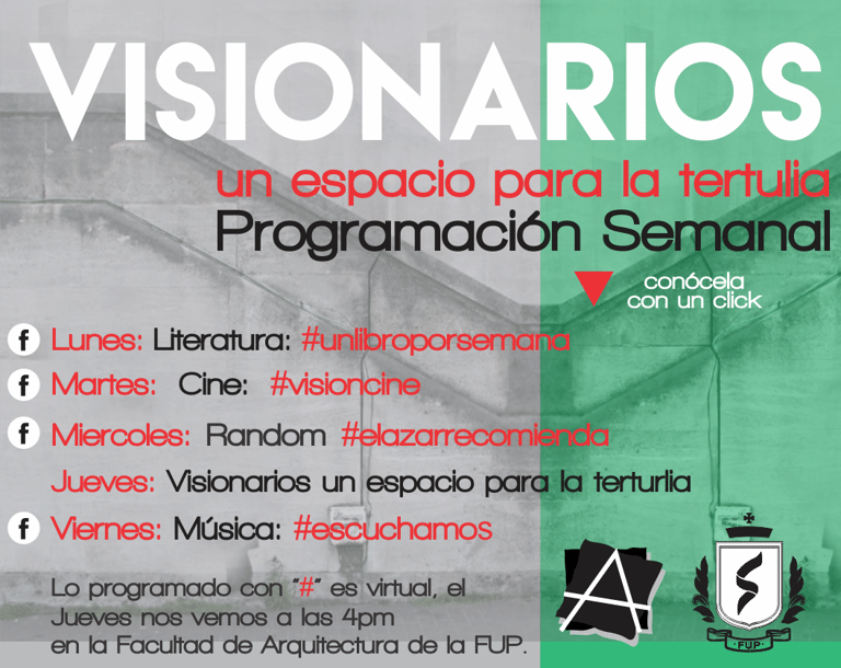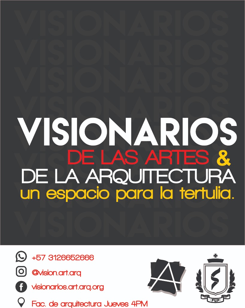 Visionarios de la arquitectura y el arte, es un espacio que nace desde los estudiantes en el 2018, que tiene tres momentos, el primero cuando es desarrollado por mi (Juan Vallejo), luego se vinculan dos estudiantes en ese momento, Linda Artunduaga y Sebastián López[1], y luego en 2020 después de volver de mi intercambio con la UDF en Brasil, se retoman el ciclo Visionarios, pero llegada la pandemia el proyecto queda en pausa, sin embargo, el ímpetu siempre existió y de cierta forma ha seguido su actividad en las clases de teoría, claramente sin alterar el contenido curricular sino complementada