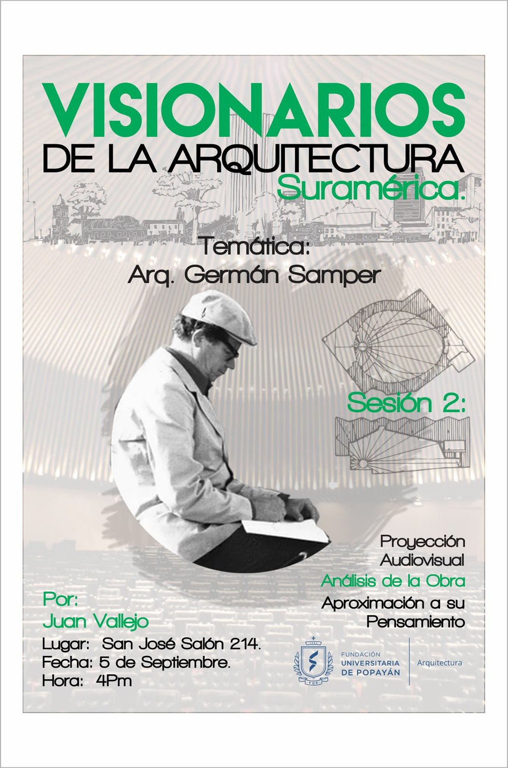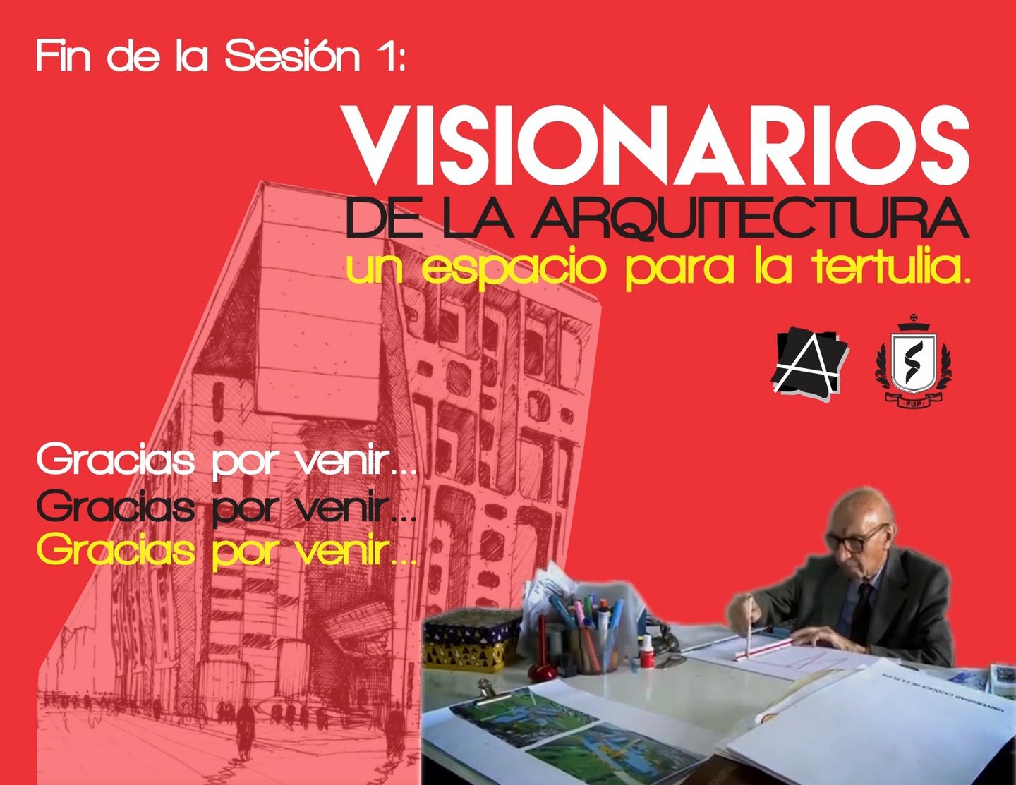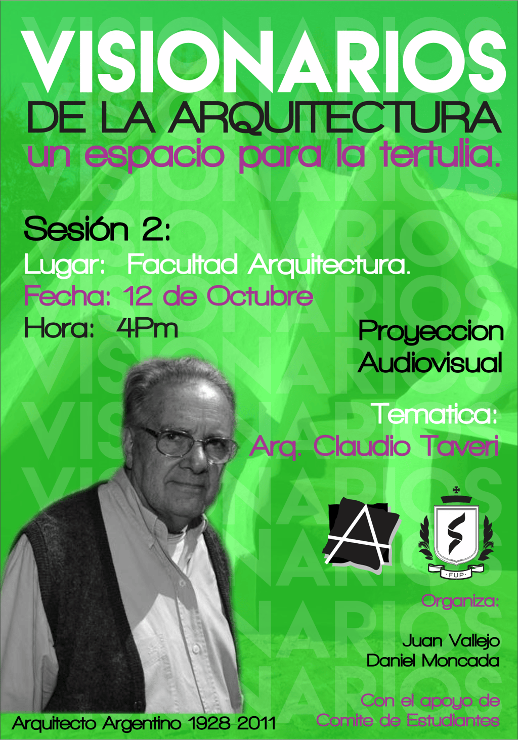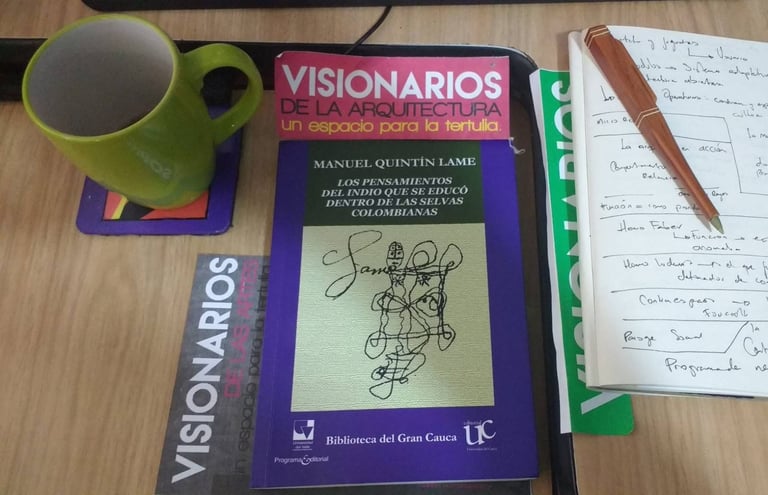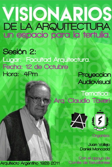 Visionarios de la arquitectura y el arte, es un espacio que nace desde los estudiantes en el 2018, que tiene tres momentos, el primero cuando es desarrollado por mi (Juan Vallejo), luego se vinculan dos estudiantes en ese momento, Linda Artunduaga y Sebastián López[1], y luego en 2020 después de volver de mi intercambio con la UDF en Brasil, se retoman el ciclo Visionarios, pero llegada la pandemia el proyecto queda en pausa, sin embargo, el ímpetu siempre existió y de cierta forma ha seguido su actividad en las clases de teoría, claramente sin alterar el contenido curricular sino complementada
